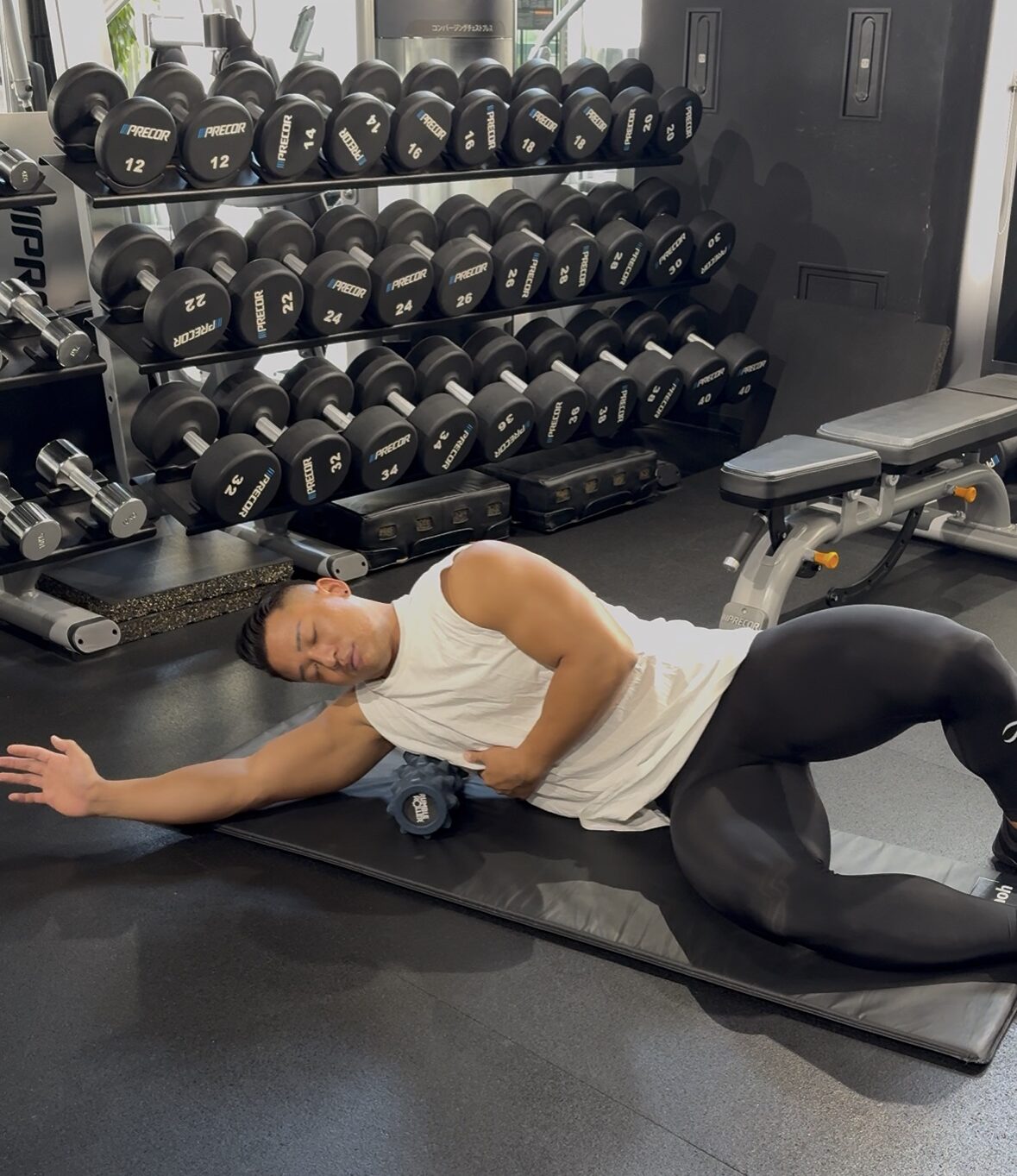 ①ストレッチポールやフォームローラーで筋肉に圧をかけてほぐす(これで筋肉がある程度ほぐれて凝りがリセットされて動かしやすくなるイメージ)